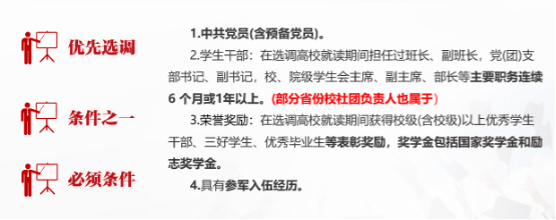 蒋老师首先介绍了选调生具有“优中选优”、“严进严出”、“储备干部”的特点,作为党政领导干部后备人选和县级以上党政机关高素质工作人员重点培养的群体,分为中央选调、定向选调、常规选调三类。老师指出选调生具有四大优势,分别是晋升快速、跨省报考、竞争较小、单独管理。报考选调生也需要具备一定条件,常规条件涉及国籍、能力、学历学位、年龄、身心健康、专业等;特殊条件包括党员(含预备党员)、学生干部、参军入伍经历、校级及以上优秀学生干部等荣誉奖励、良好学习成绩等,需要同学们清楚明确自身条件进行报考。