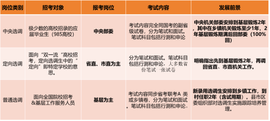 蒋老师强调不同地区针对选调生有不同的硬性要求,例如江苏地区要求最为严格,需要满足所有条件,大部分地区则是三个条件满足两个,而浙江地区则较为宽松,在薪资待遇、晋升路径等方面综合而言适宜报考。不同地区的考试形式也不尽相同,就笔试而言,有单料、双料和多料考试,主要以行测、公基和申论为主;就面试而言,则有结构化面试、结构化小组面试、无领导小组讨论面试等多样的考察形式。