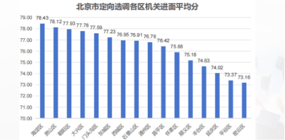 北京市定向选调各区机关进面平均分数不尽相同,海淀区、房山区、朝阳区等区需要至少77.5分以上,而一些区如延庆区、平谷区、密云区则进面平均分稍低。