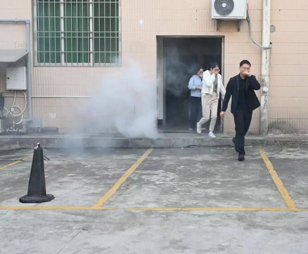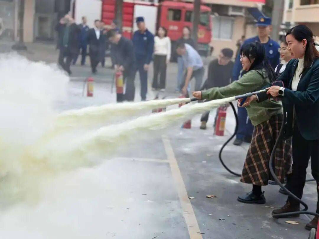 随着演练总指挥一声令下,疏散逃生演练环节正式拉开帷幕。只见办公楼一楼逃生出口瞬间“浓烟弥漫”,一阵急促的警报声(哨声)骤然响起。干部职工们低头弯腰,捂住口鼻,沿着安全通道快速有序撤离……模拟火情发生后,应急演练立即启动。疏散环节,干部职工在规定时间内全部安全抵达集结地点,过程井然有序。在灭火实操区,面对铁桶内燃起的熊熊烈火,参训人员在教官指导下轮番上阵。“提、拔、握、压”,大家牢记口诀,手持灭火器对准火焰根部喷射,成功将火源扑灭,操作规范到位。事后不少同事表示,这种“沉浸式”体验比单纯听课印象深刻得多。