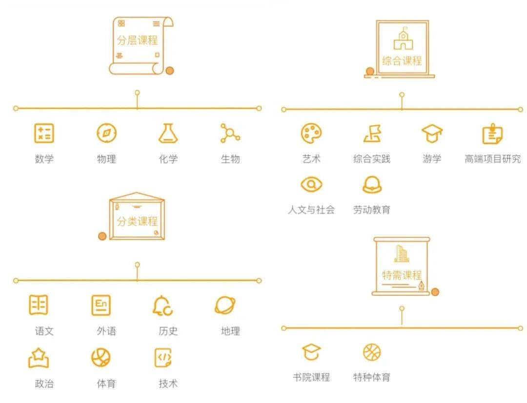 学校课程以“分层分类、综合开放”为目标,融入综合课程和特需课程理念,为学生全面发展提供坚实平台。新高一数、物、英三科将根据学生的不同水平,采用分层走班的形式,让学生在这些学科的课堂上能够更加适切,收获感更强。语文为必选课程,政治、地理、历史、化学、生物采用分类课程。I类课程主要面对参加合格性学业水平考试的学生,II类课程主要针对参加等级考试的学生设置。